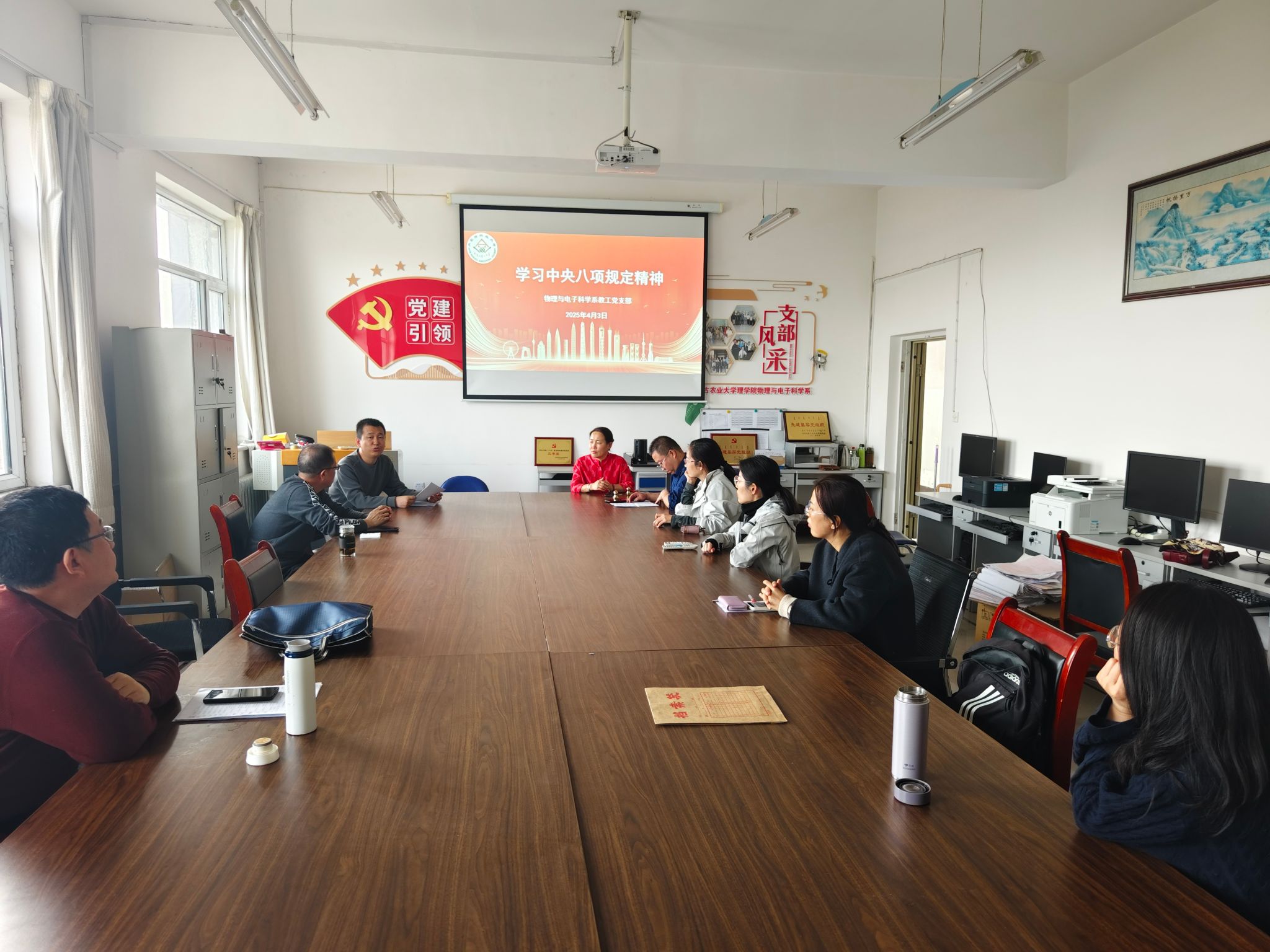 为深入学习贯彻习近平总书记关于中央八项规定精神学习教育的重要讲话和重要指示精神,提高全体党员的政治站位和责任意识,4月7日,物理与电子科学系教工党支部在304永利415会议室召开深入贯彻中央八项规定精神专题学习教育,全体党员参加会议。