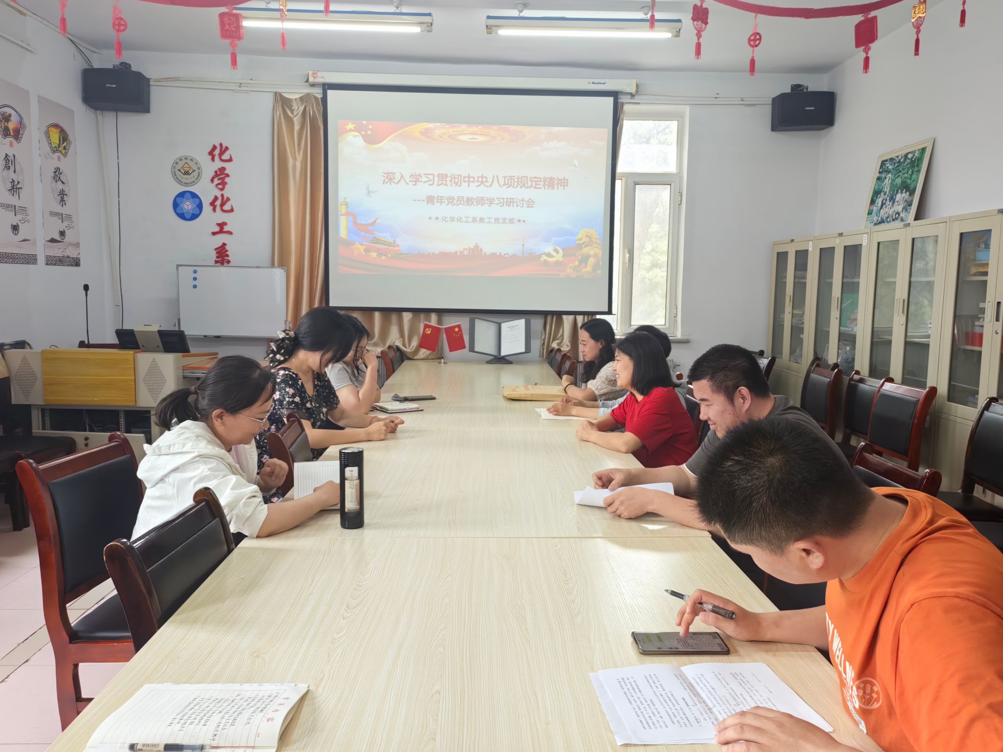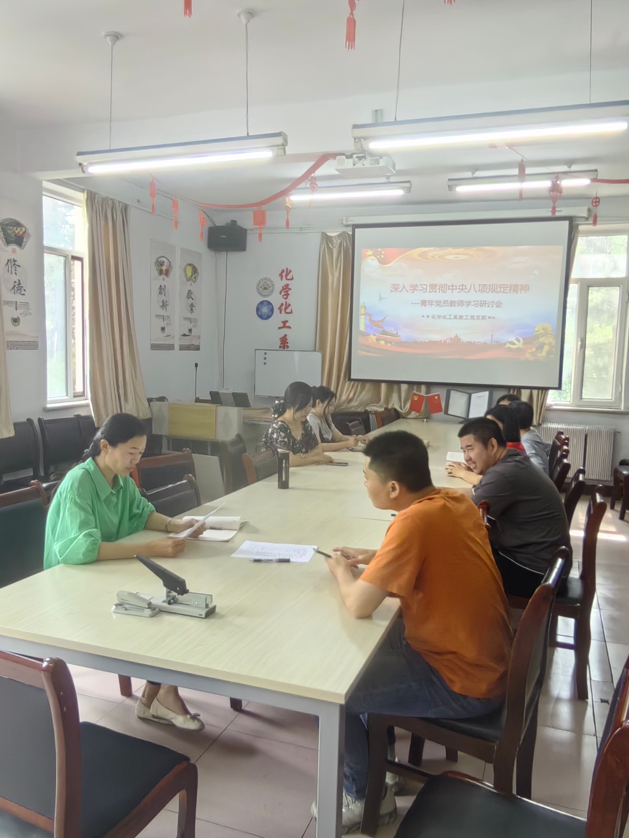 为持续深化中央八项规定精神学习教育,引导青年教师党员筑牢廉洁从教思想防线,6月16日,化学化工系党支部组织召开了青年教师党员“深入贯彻中央八项规定精神”专题研讨会。会议由化学化工系党支部委员包力尔主持,青年党员教师参加。