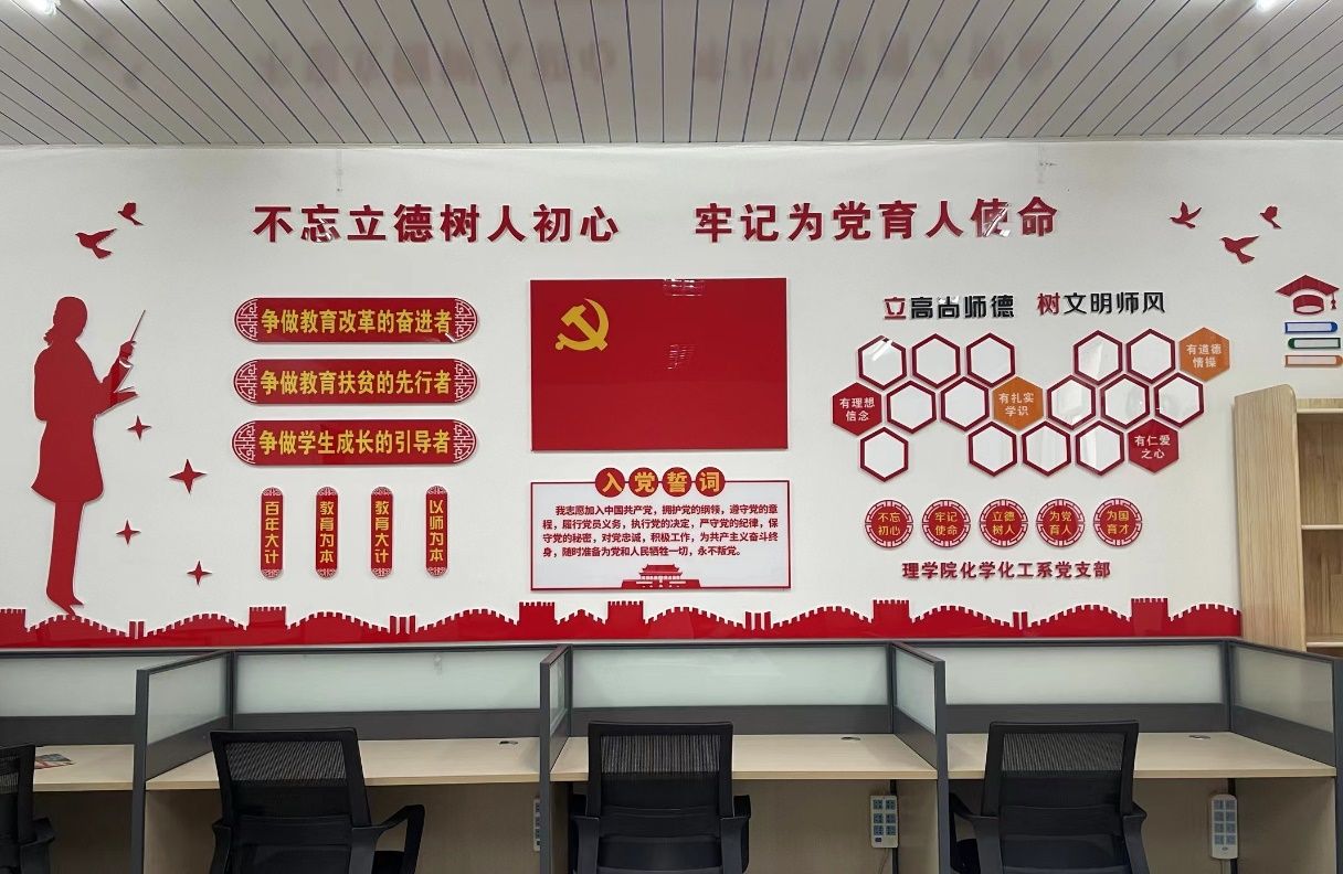 党建文化墙的建设作为支部党建工作的新窗口、宣传党建知识的新载体,增强了支部党建学习氛围,提升了党性修养,强化了师德师风建设,对化学化工系党支部推动党建与业务工作融合发展,坚持以党的政治建设引领化学化工系高质量发展,起到积极作用。