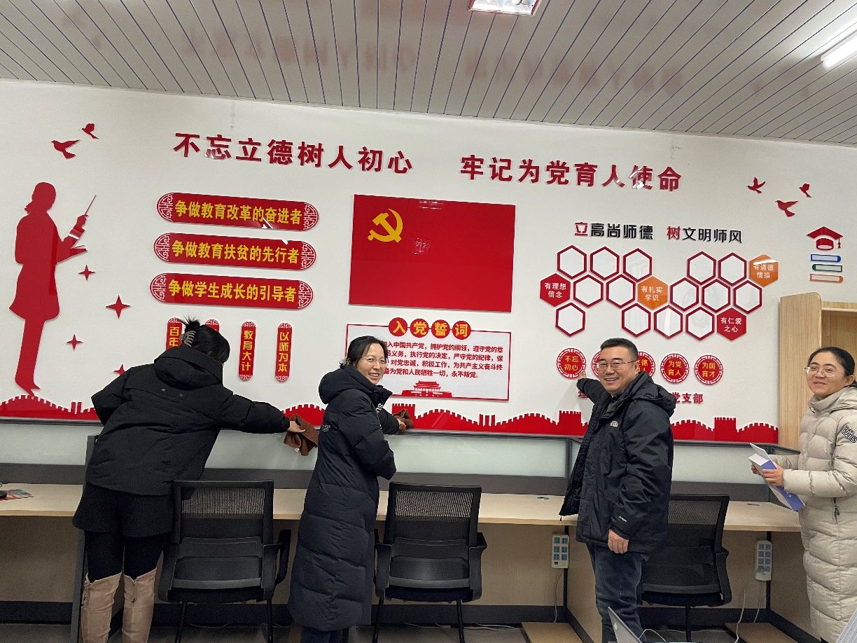 党建文化墙设计的主题为“不忘立德树人初心,牢记为党育人使命”,包括教师工作的重要意义、教师的根本任务和重大使命、习近平总书记对教师队伍的殷切希望、师德师风建设、争做“四有”好老师、入党誓词等内容。通过这些内容,以党支部为依托,有形有感有效的开展教育,引导广大教师感党恩听党话跟党走,凝心聚力,团结奋进。