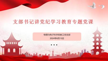 为深入学习贯彻习近平总书记关于开展党纪学习教育的重要讲话和重要指示精神,强化党员纪律意识,推动党纪学习教育走深走实,6月13日下午4时,物理与电子科学系教工党支部在304永利415会议室开展了支部书记讲党纪学习教育专题党课活动,支部无课教师党员参加了活动。