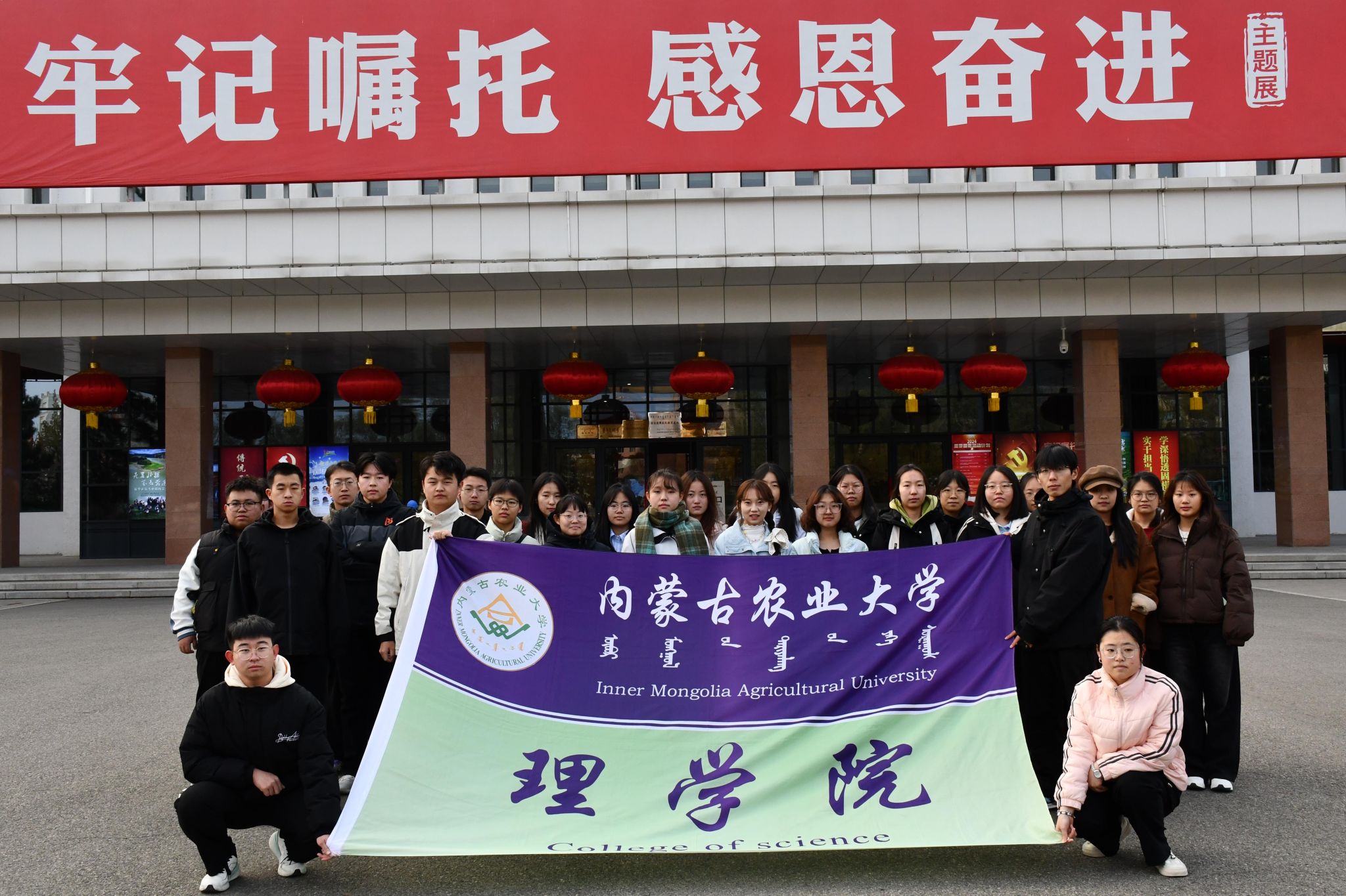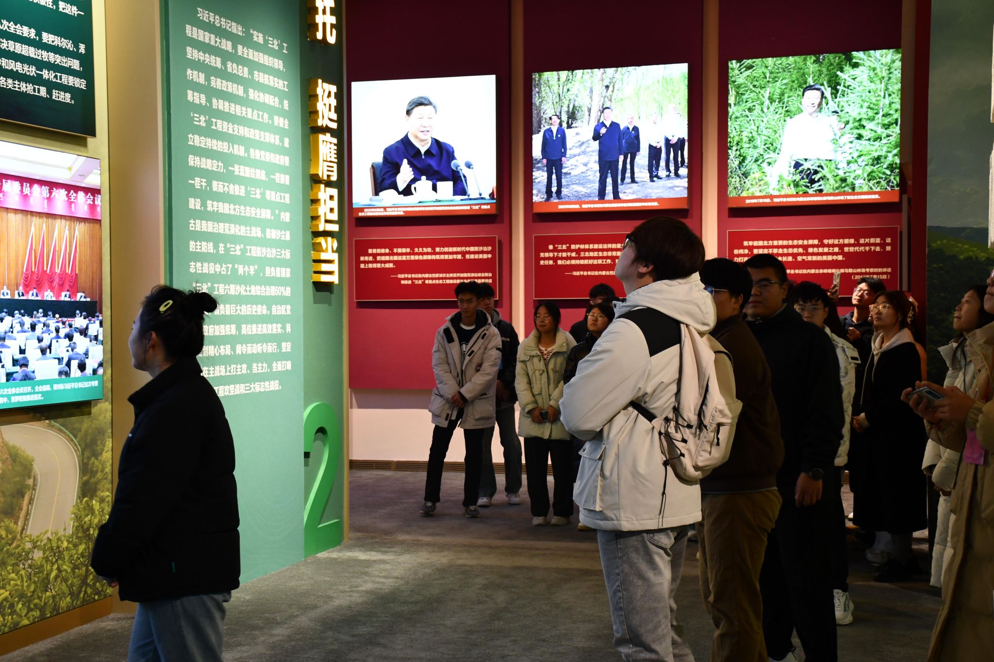 活动伊始,同学们在内蒙古展览馆一楼大厅签到。随后,由解说员带领大家进入内蒙古防沙治沙和"三北"工程攻坚战主题展展厅。展览通过“牵挂‘三北’ 殷殷嘱托” “不负重托 挺膺担当” “鏖战‘三北’ 绿润北疆” “科学治理 守正创新” “‘三北’精神 赓续传承”五个部分,通过图片、文字版、图表图例、实物展品和数字多媒体,集中展示党的十八大以来,在习近平生态文明思想引领下,内蒙古各族干部群众坚决扛起筑牢我国北方重要生态安全屏障的政治责任,认真贯彻落实党中央关于推进“三北”工程建设的战略部署。过程中,员工们认真聆听讲解,驻足观看,深刻感受到从茫茫沙海到片片绿洲,从生态恶化到生态好转的每一个转变都凝聚着无数人的心血和汗水。进行了沉浸式学习。最后,全体同学在展览馆门口合影留念。至此,此次观展活动圆满结束。