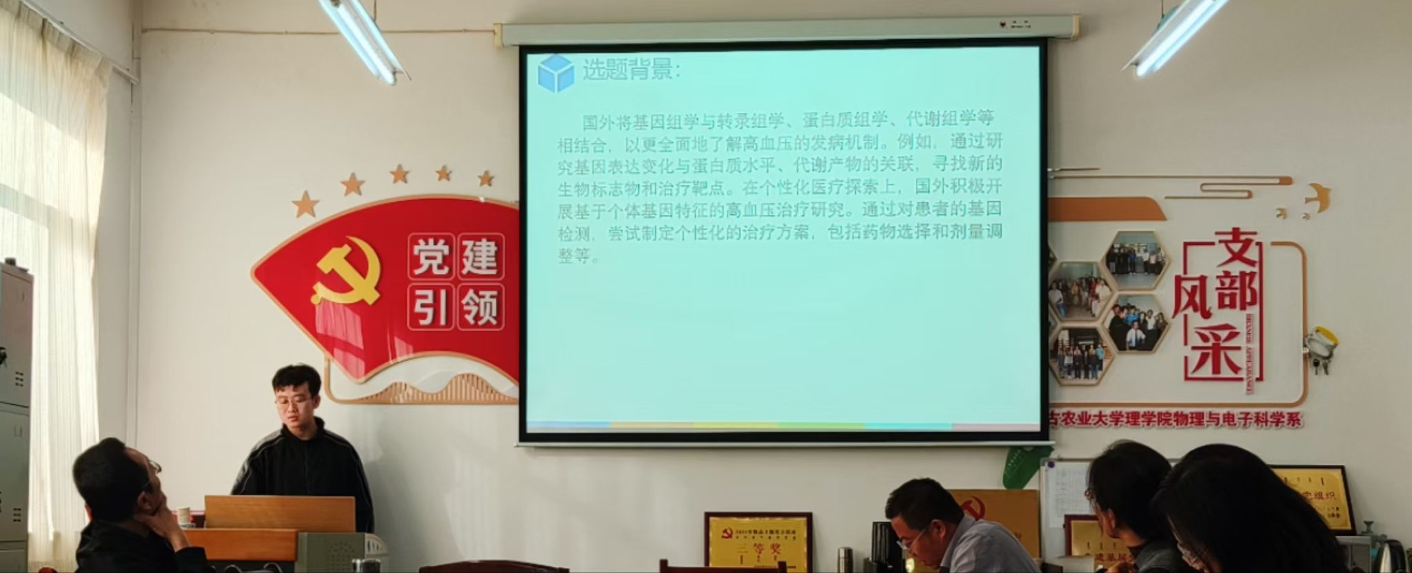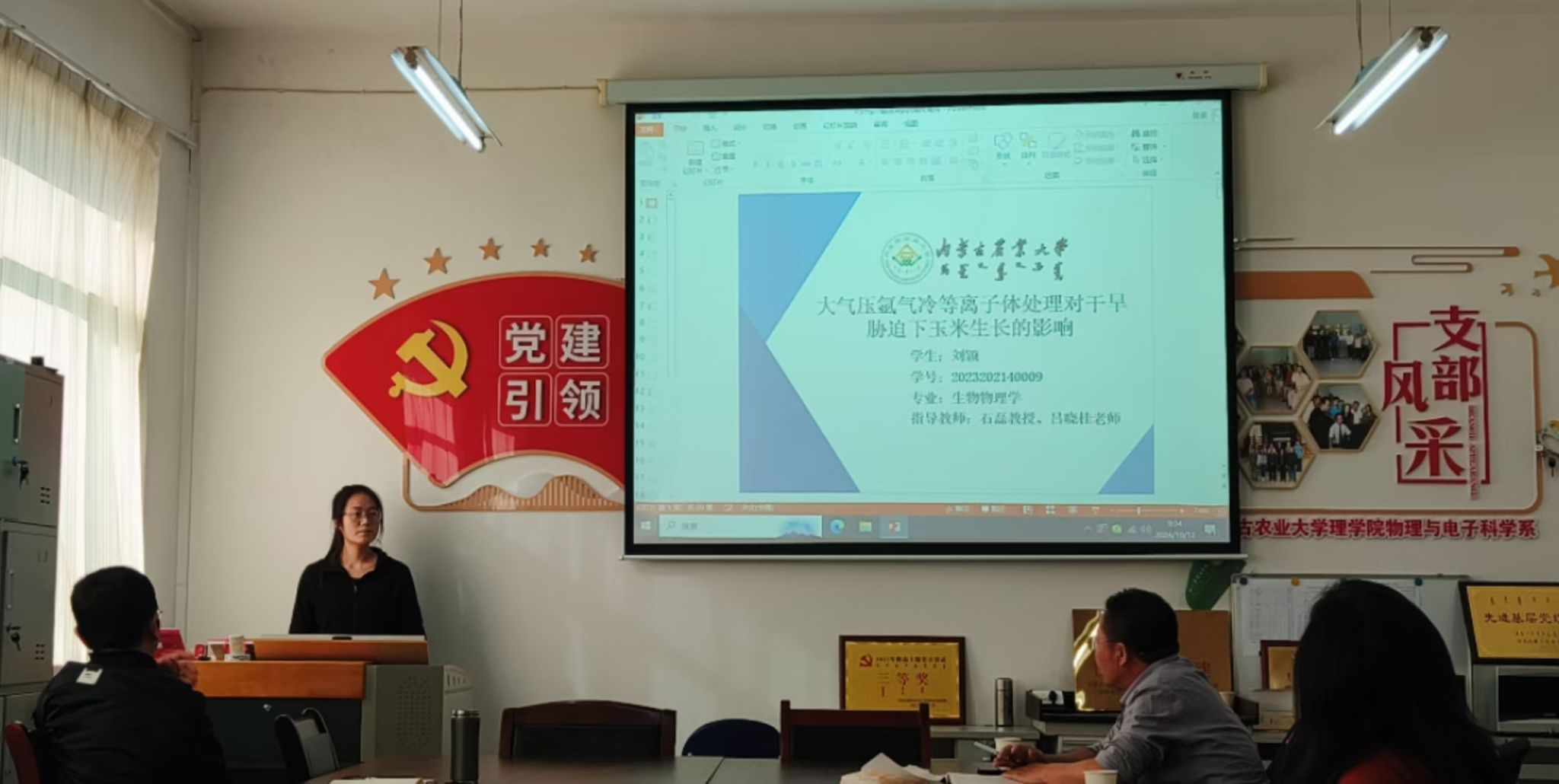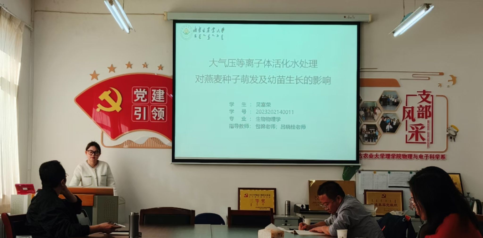 会上,2023级的4名硕士研究生进行了开题报告及工作小结。刘玮同学报告的题目为 “高血压相关基因及其编码蛋白与金属离子、药物小分子的相互作用”,汇报了目前的研究工作进展情况以及遇到的问题。刘颖同学的报告题目为“大气压氩气冷等离子体对干旱胁迫下玉米生长的影响”,详细介绍了工作的研究背景、研究内容与研究方法,以及进展情况,同时也提出了目前遇到的问题。牛晓玉同学汇报了“肥胖糖尿病相关基因表达及其编码蛋白与配体相互作用的研究”,详细地介绍了研究内容和已经尝试的研究方法,给出了主要创新点,并就目前遇到的困难和下一步的解决方案进行了说明。最后,吴富荣同学以“大气压等离子体活化水处理对燕麦种子萌发及幼苗生长的影响”为题进行了开题报告,报告中阐明了该研究的意义,并就研究内容、方法以及目前的工作进展做了汇报,同时也给出了下一步的研究方案。