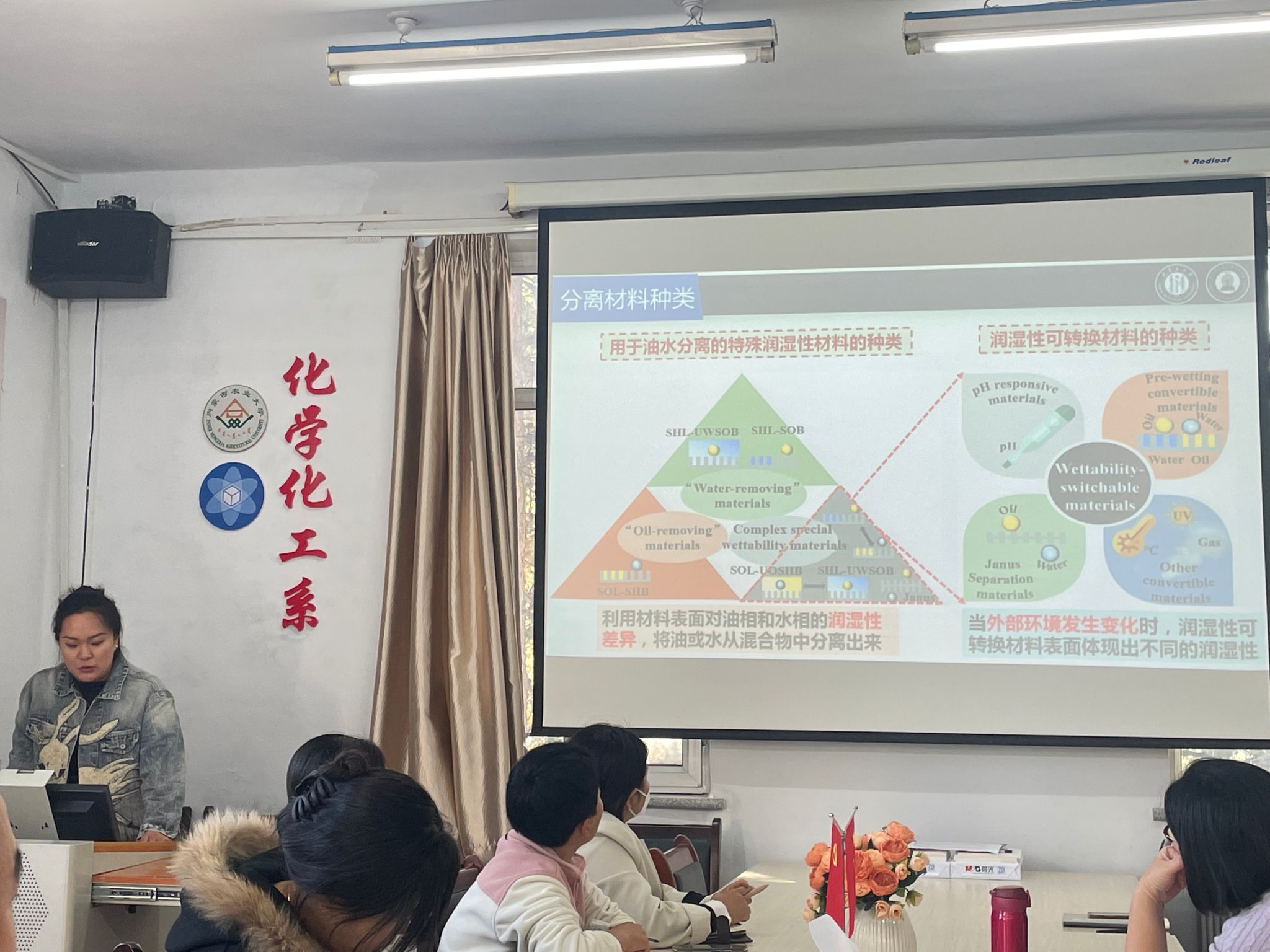 此次讲座由新晋优秀博士王一雯老师做了题为“基于多功能应用的含油污水净化纤维材料的制备及其性能研究”的学术报告,主要介绍了一些常见的含油污水油水分离方法,特别是含有大量表面活性剂成分的乳液油水分离的策略。随后,王老师介绍了她在构建油水分离材料方面的研究进展,制备了不同的可重复使用的纤维材料,探究了其油水分离效果和去除其他水中杂物的能力。